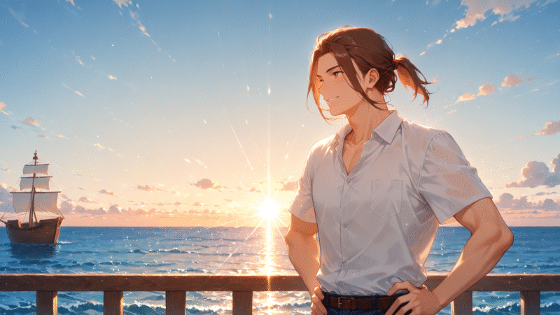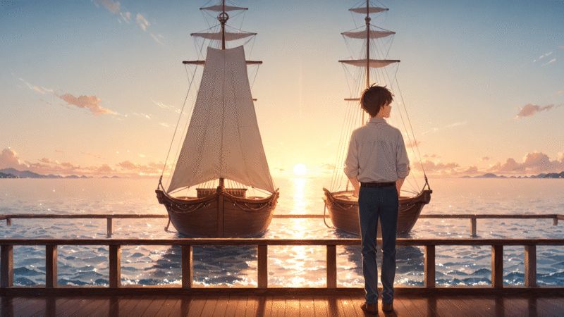 朝の発見 朝日が船のデッキを照らしていた。 Wa…