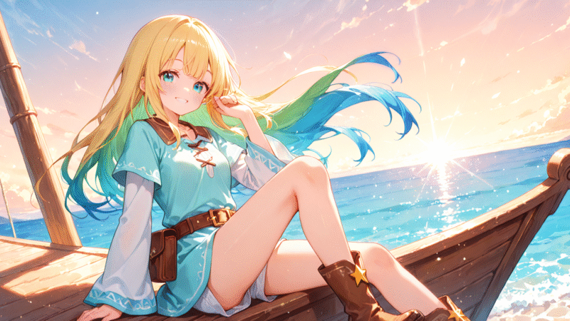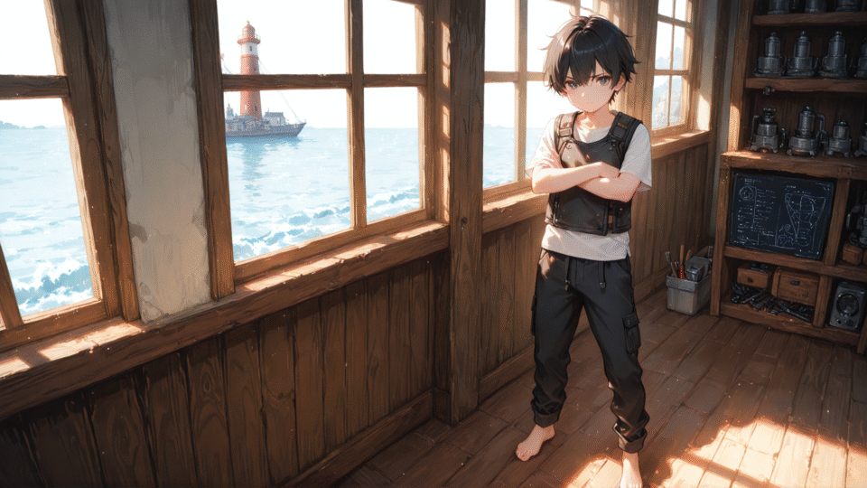 朝の決意 朝日が船を照らす中、Leaveは一人、…