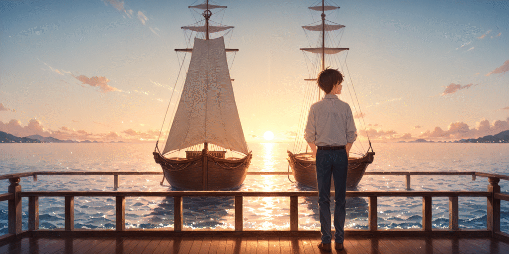 朝の海は穏やかだった。 大きな船の甲板に立つ青年——かつての少年は、潮風を深く吸い込んだ。 筏で旅立ってから、どれほどの時が流れたのだろう。顔には精悍さが宿り、瞳には確かな光がある。 海図に新しい島の位置を書き込みながら、仲間たちの声が聞こえ... -