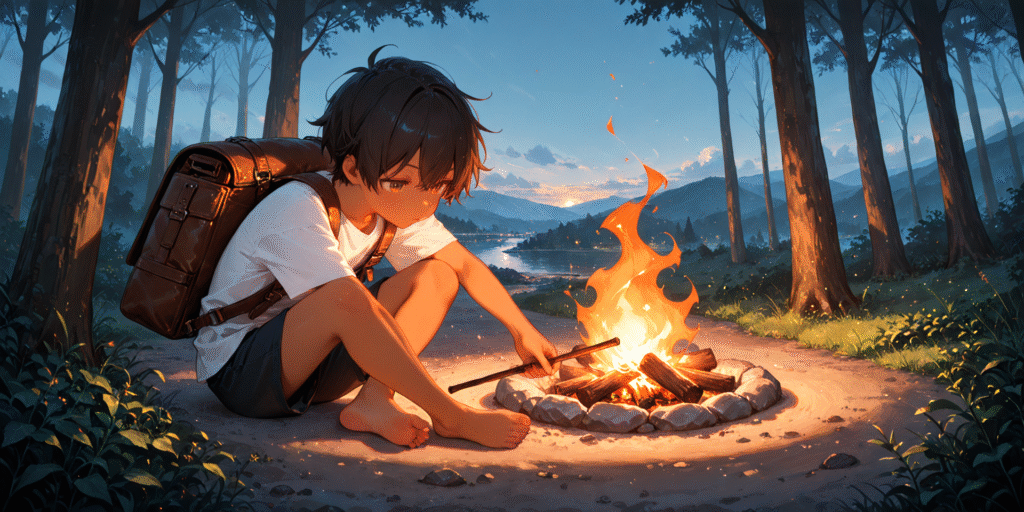 川沿いを下り始めてから、どれほど経っただろう。 季節が移ろい始めていた。朝の空気が少しずつ冷たくなり、木々の葉が色づき始める。日が昇り、日が沈む。その繰り返しの中で、少年は一人で生きることを学んでいった。 朝、鳥の声で目を覚ます。 川辺へ下... -