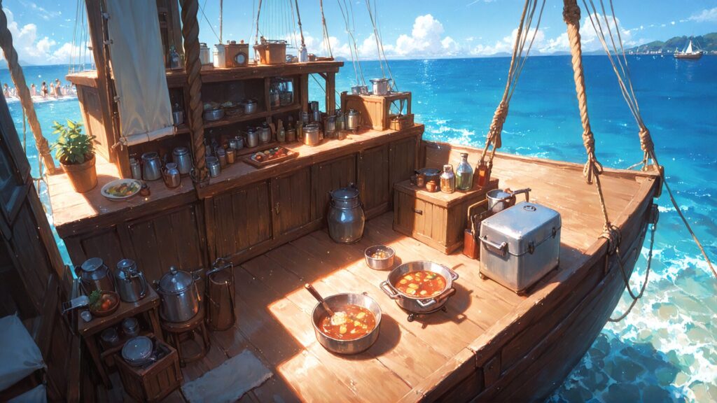 出航から三日目の朝。船は穏やかな海を進んでいた。 朝の厨房 - 予期せぬ師弟 薄暗い厨房に、規則正しい包丁の音が響く。 Can「いつもならこの時間、私だけのはずなのに...」 扉を開けると、すでにCookが仕込みを始めていた。野菜の切り方、包丁を握る角度... -